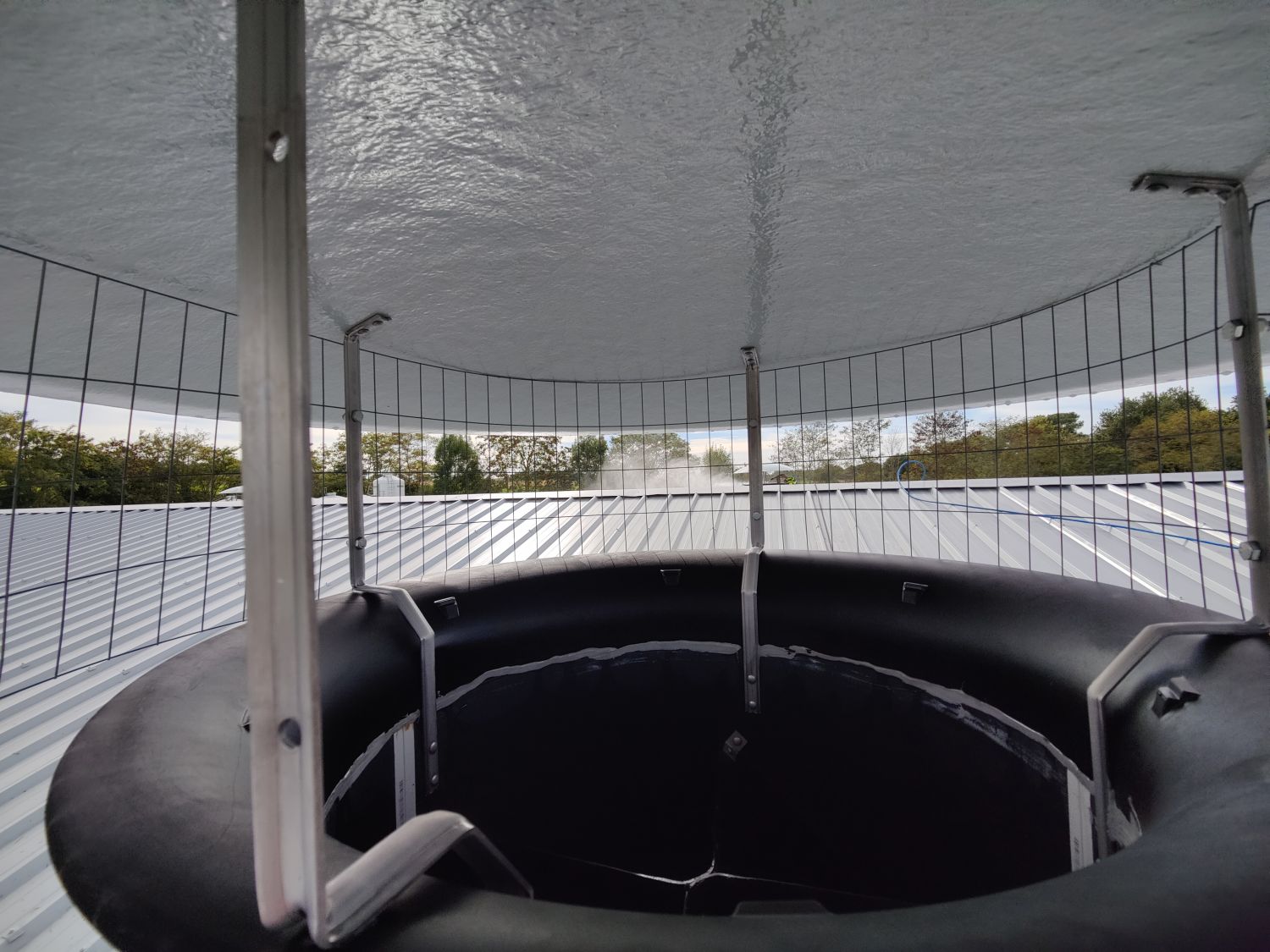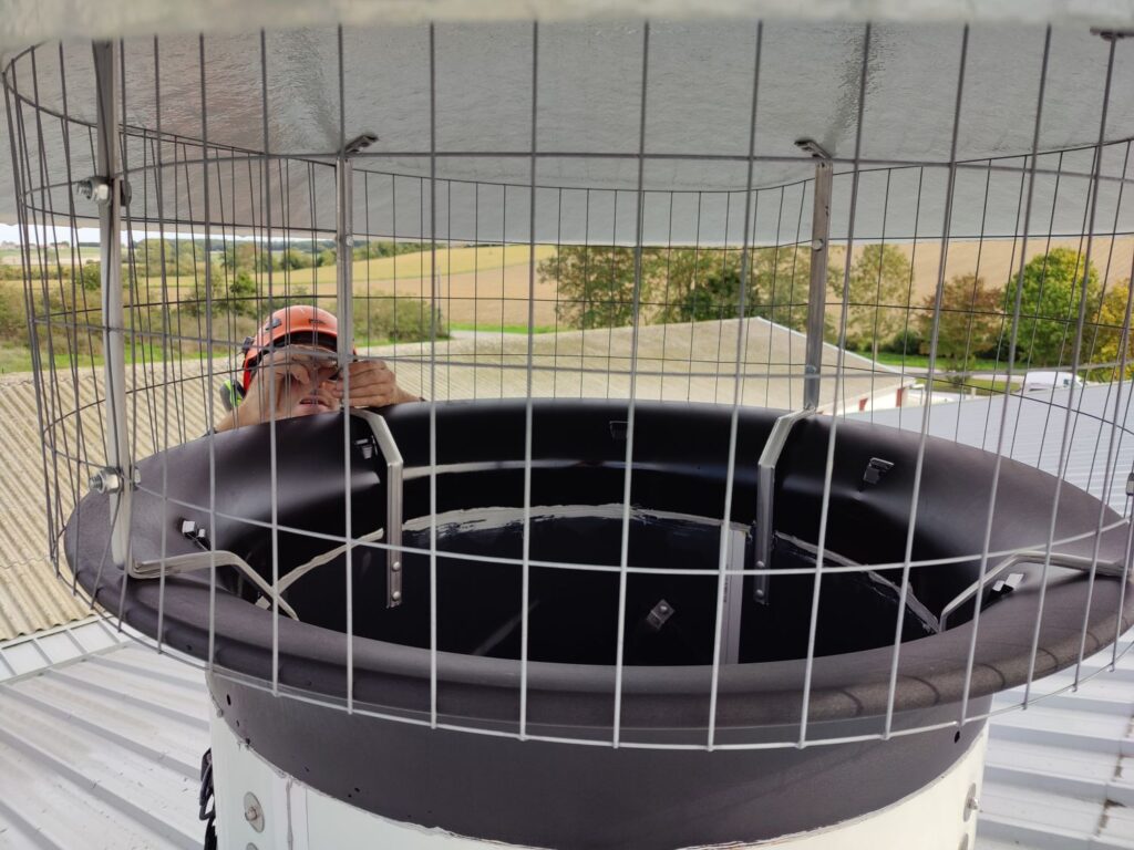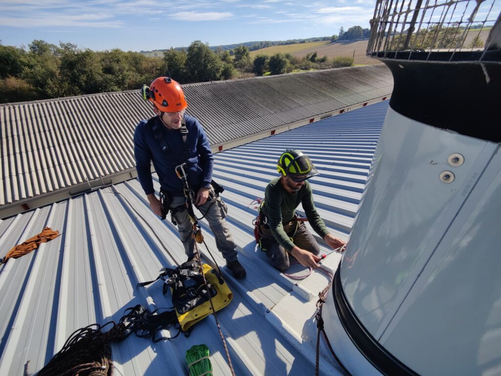Le nettoyage à haute pression d’extracteurs d’air de hangar agricole est une intervention de maintenance essentielle. Sans ligne de vie, le cordiste peut s’assurer lui-même avec des cordes amarrées sur des ancrages solides.
