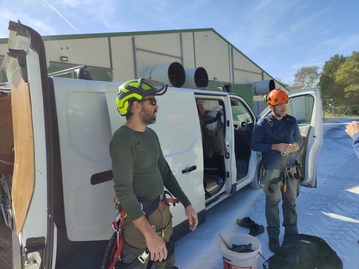 Cette intervention est typique des travaux d’accès difficile. L’absence de ligne de vie permanente (un câble de sécurité fixé au toit) oblige les techniciens à créer leur propre système de sécurité temporaire.